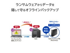 ■データ保存における信頼性とコストパフォーマンスを追求した法人向けNAS「ランディスク」です。24時間・常時稼動を前提に開発された高信頼HDDの採用し、高い支持を得ているデータ保護技術「RAIDeX(拡張ボリューム)」によって、安心できる業務環境の構築に貢献します。■「RAIDeX(拡張ボリューム)」とは、内蔵HDD2台を1つのペアとしファイル単位でデータをミラーリングする技術です。HDDペア間の稼働時間に差をつけることで同時故障によるデータ全消失のリスクを低減します。■ランサムウェアは、感染したパソコンから読み書きできるデータ(内蔵HDD、パソコンに接続したUSB HDD、共有されたNASなど)の暗号化を試みます。そこでランディスクは、ランサムウェアの探索からUSB HDDを隠す機能を搭載。バックアップデータを不正な暗号化から守ります。■「履歴差分バックアップ」は、バックアップ時点のフォルダー構造のまま差分データのみを日付ごとにUSBハードディスクへ保存します。また、1回の操作で特定の日付のデータをまとめて復元できるので、面倒な操作は不要です。