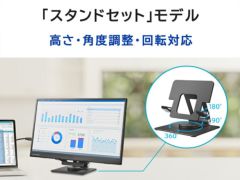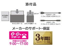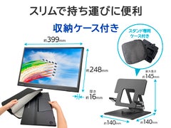 輝度:220cd/m2/応答速度:5ms/最大消費電力:7.5W/■17.3型モバイルディスプレイです。USB Type-Cなら映像出力と給電をケーブル1本で行うことができます。また、スリムな筐体なので手軽に持ち運びできサッと片づけられるため便利です。高さ・角度調整・回転対応の「スタンドセット」もラインアップ。■モバイルディスプレイ単体に加えて、スタンドがセットされたモデルもラインアップ。セットモデルは利用シーンに合わせてお好みの高さ・角度に調整、回転ができるスタンドが標準で添付されています。■USB Type-Cディスプレイ給電に対応しているので、添付しているUSB Type-Cケーブルで接続することにより、パソコンからの映像出力と給電がケーブル1本で行われます。 電源コンセントに繋ぐ必要がないため、どこでも好きな場所でお使いいただけます。■パススルー機能に対応しているので、接続しているUSB充電器からノートパソコン、スマホ、タブレットに給電できます。ACアダプターや充電器を接続しなくてもよいため、USB Type-C端子が1ポートしかなくても映像を映しながら給電ができ、快適に使っていただけます。