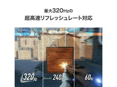 輝度:300cd/m2/応答速度:0.4ms/最大消費電力:50W/■広視野角のAHVAパネルを採用した24.5型ゲーミングモニターで、最大320Hzの高リフレッシュレートに対応。応答速度0.4ms[GTG]、内部遅延約0.05フレーム(約0.15ミリ秒)という超低遅延設計により、FPSゲームにおいて圧倒的なパフォーマンスを発揮します。■DisplayPort接続で最大320Hzの超高速リフレッシュレートに対応。1秒間に最大320回映像を書き換えができるため、一般的な60Hzモニターの約5.3倍、240Hzモニターの約1.3倍の滑らかさを実現。FPSゲームでは、正確なエイムやリコイルコントロールをサポートします。■一般的に、液晶パネルのある色から別の色へ変化する際に、色変化にわずかに時間がかかり、それが映像描写の遅延となりブレにつながります。Clear AIM機能は、リフレッシュレートに応じてバックライトを点灯/消灯させ、動きの激しい映像の「ブレ(モーションブラー)」を低減。■ゲーム内FPS値が変動することによって発生する「ティアリング(映像のずれ)」、「スタッタリング(カクつき)」に対してモニターも合わせてリフレッシュレートを変動(可変)させることで「映像のずれ、カクつき」の発生を抑えます。