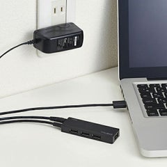 ■ACアダプターが付属するセルフパワー・バスパワー共用タイプの4ポートUSBハブです。 ■インターフェイス:USB2.0 ■コネクタ形状:パソコン側(アップストリームポート):USB Ax1/周辺機器側(ダウンストリームポート):USB Ax4 ■対応OS:Windows 11/10/8.1/7/Vista/XP、macOS 13/12/11/Macintosh OS X 10.11 ■最大転送速度:USB2.0ハイスピード/480Mbps(理論値)、USB1.1フルスピード12Mbps(理論値) ■アップストリーム(パソコン側)ポート数:1ポート ■ダウンストリーム(周辺機器側)ポート数:4ポート ■USBケーブル方式:USB2.0 ■USBケーブル長:約1.5m(コネクターを除く) ■電源方式:セルフパワー ■供給可能電流:セルフパワー時:4ポート合計2000mA(1ポート当たり500mA未満)バスパワー時:4ポート合計400mA(1ポート当たり100mA未満) ■DCケーブル長(付属ACアダプター):約1.4m(コネクターを除く) ■カラー:ブラック ■外形寸法:約幅82.5×奥行28.0×高さ11.0mm(ケーブルを除く) ■重量:約50.0g ■動作環境:温度5~40℃、湿度30~80%(結露なきこと) ■付属品:専用ACアダプター ■電気用品安全法:PSE適合(ACアダプター) ■保証期間:6カ月間