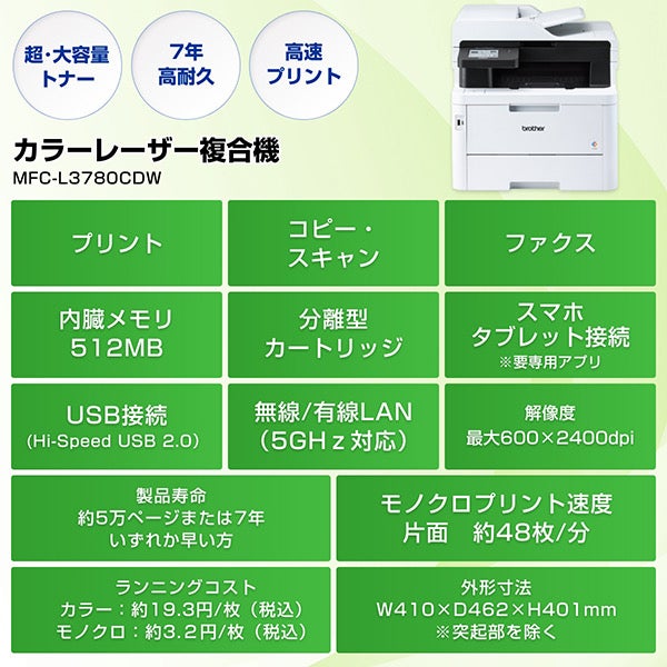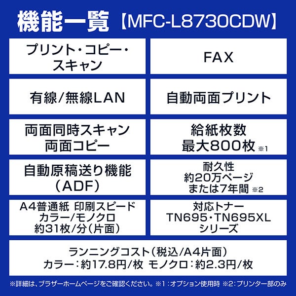 他の画像を見る ブラザー [MFC-L8730CDW] A4カラーレーザー複合機 (コピー/プリント/スキャン/FAX/自動両面印刷/有線・無線LAN) ¥ 77,271 税込 カートに入れる お気に入りに登録する