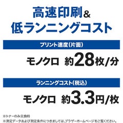 ●7年間の高耐久で本体寿命が長く、買替えの手間を軽減●約5000ページ印刷可能な超・大容量トナー対応でトナー交換の手間を軽減。トナーカートリッジ廃棄量の削減にもつながります●給紙・排紙・トナー交換などの操作を前面から行うことができます。省スペース設計なので本体の場所を取りません●トナーとドラムを別々に交換することができる分離型を採用。両方の部品を無駄なく使いきることができるため、環境負荷も軽減●自動両面印刷に対応。用紙コストが半分になり、紙資源の節約に貢献します●安定・高速通信であるWi-Fi5GHzにも対応。Bluetooth対応機器や他の電化製品で使用するWi-Fi2.4GHzとの干渉が起きにくく、安定した高速通信が実現●プリント/コピー/スキャン対応●モノクロ液晶:2行LCDパネル●標準用紙トレイ:1段(最大250枚)●手差しトレイ:1枚●印刷速度:約28枚/分●自動両面プリント対応●搭載メモリ:128MB●インターフェイス:USB/無線LAN●Wi-Fi Direct対応●対応消耗品:TN32JXL/TN32JXXL/DR32J