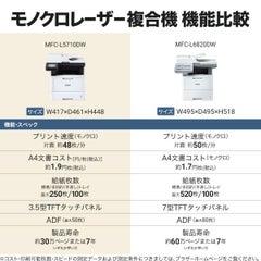 ●約11000ページ印刷可能な大容量トナー対応でトナー交換の手間を軽減。トナーカートリッジ廃棄量の削減にもつながります●7年間の高耐久で本体寿命が長く、買替えの手間を軽減●給紙・排紙・トナー交換などの操作を前面から行うことができます。省スペース設計なので本体の場所を取りません●トナーとドラムを別々に交換することができる分離型を採用。両方の部品を無駄なく使いきることができるため、環境負荷も軽減●安定・高速通信であるWi-Fi5GHzにも対応。Bluetooth対応機器や他の電化製品で使用するWi-Fi2.4GHzとの干渉が起きにくく、安定した高速通信が実現●プリント/コピー/スキャン/ファクス対応●カラータッチパネル液晶:3.5型●標準用紙トレイ:1段(最大250枚)●多目的トレイ:最大100枚●ADF(自動原稿送り装置):最大50枚●印刷速度:約48枚/分●自動両面プリント対応●両面同時スキャン対応●搭載メモリ:512MB●インターフェイス:USB/有線LAN/無線LAN●Wi-Fi Direct対応●対応消耗品:TN70J/TN70JXL/TN70JXXL/DR70J●オプション品:LT-5505(2段まで増設可)/LT-6505(2段まで増設可)