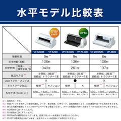 幅広い業務に応えるビジネス機のスタンダードモデル。136桁水平型、9枚複写(オリジナル+8枚)。ネットワーク標準。漢字高速モード261字/秒で前機種のVP-4300より約20%印字速度がアップ。また操作性抜群の1.44インチカラーLCDパネルを搭載。わかりやすい日本語表記で、エラー表示などプリンターの状態が一目で確認でき、給紙方法や用紙種類も設定がカンタンです。国際エネルギースタープログラム適合。消費電力を大幅に削減し省エネに貢献します。
