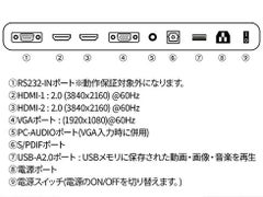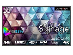 24時間365日の連続稼働に対応し、4K解像度に対応した55インチ大型デジタルサイネージディスプレイとなります。上下左右178°の広視野角を実現した高画質IPSパネルを採用。USBメモリーのからのコンテンツ(動画、写真、音楽)の再生に対応、モニターの電源がオンになった際に自動的にUSBメモリー内のコンテンツ再生を開始する自動再生機能を装備。24時間365日の連続稼働にも対応していますので、24時間営業の施設などでのサイネージにも最適です。コンテンツを再生可能なUSBポート搭載しますのでPCやSTBが無くてもサイネージとしてお使いいただけます。HDMI2.0端子を2つとVGA端子を装備しますので、PCやSTBに接続しての使用も可能です。4辺に同じ幅のベゼルを採用していますので複数のサイネージを組み合わせての使用にもお勧めです。*マルチディスプレイで使用する際は出力側のSTBにてコンテンツのコントロールが必要です。 400x400のVESAマウントに対応、対応の壁掛け金具やスタンドなどに取り付けが可能です。モニター自立用のスタンドは同梱しませんので別売の壁掛け金具やスタンドをご使用ください。5Wx2のステレオスピーカーを搭載します。購入から3年間のメーカー保証が付きます。