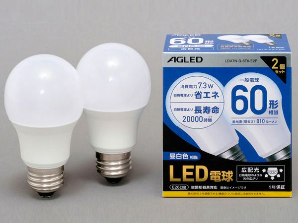 商品名:LED電球 E26 広配光 60形相当 昼白色 2個セット(20000時間)