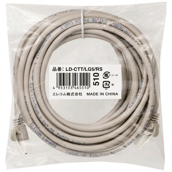 商品名:RoHS指令準拠LANケーブル/CAT5E/爪折れ防止/5m/ライトグレー/簡易パッケージ
