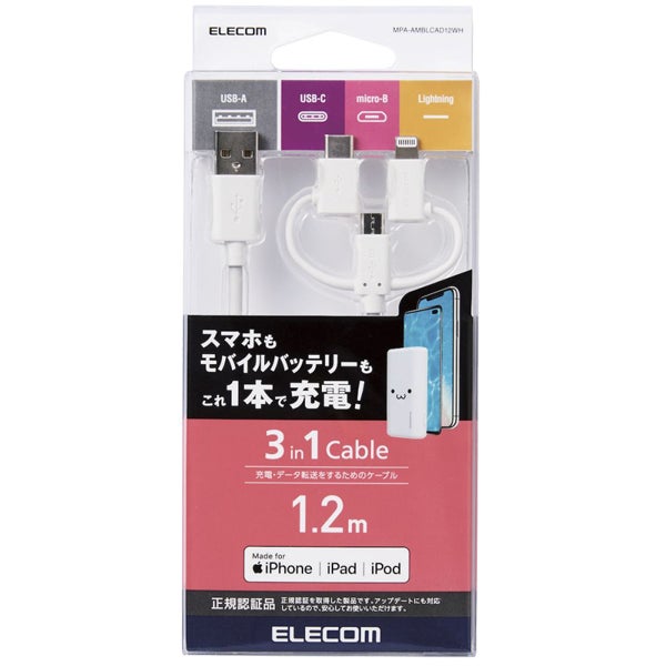 他の画像を見る ELECOM [MPA-AMBLCAD12WH] スマートフォン用USBケーブル/3in1/microUSB+Type-C+Lightning/1.2m/ホワイト ¥ 3,580 税込 カートに入れる お気に入りに登録する