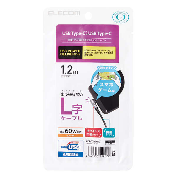 他の画像を見る ELECOM [MPA-CCL12NBK] USB Type-Cケーブル/スマホ用/USB(C-C)/USB Power Delivery対応/認証品/L字コネクタ/抗菌・抗ウイルス/1.2m/ブラック ¥ 1,555 税込 カートに入れる お気に入りに登録する