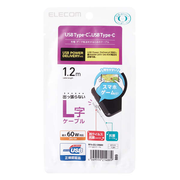 他の画像を見る ELECOM [MPA-CCL12NWH] USB Type-Cケーブル/スマホ用/USB(C-C)/USB Power Delivery対応/認証品/L字コネクタ/抗菌・抗ウイルス/1.2m/ホワイト ¥ 1,529 税込 カートに入れる お気に入りに登録する