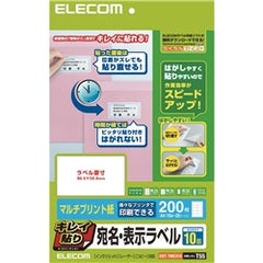 ●台紙からはがしてラベルを貼り付けると、徐々に粘着力が強くなる特殊粘着剤を使用した宛名・表示ラベルです。●貼り付けた直後は弱粘着なので、ゆがみやズレなどを整えるための貼り直しが可能です。●貼り付け後、約24時間で強粘着になるので、郵送時にラベルがはがれる心配がありません。●台紙の一部を切り取れるようにしており、ラベルがつかみやすく、台紙から簡単にはがすことができます。●マルチタイプの用紙なので、インクジェットプリンタ、レーザープリンタ、コピー機でも印刷可能です。●手書きもできるので、手軽に宛名ラベルを作成することができます。●無料でダウンロードできるエレコムのラベル作成ソフト「らくちんプリント」をお使いいただくと、簡単にデザイン・印刷が可能です。■用紙サイズ:幅210mm×高さ297mm ※A4サイズ■一面サイズ:幅86.4mm×高さ50.8mm■ラベル枚数:200枚 ※20シート×10面■用紙タイプ:マルチプリント紙■カラー:ホワイト■紙厚:0.19mm■坪量:161g/m2■テストプリント用紙:テストプリント用紙1枚■お探しNo.:T55■セット内容:ラベル×20、テストプリント用紙×1