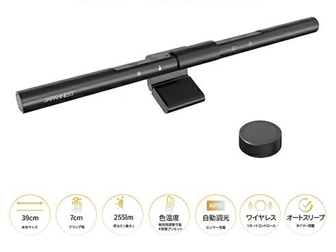 ディスプレイ上部に取り付ける省スペース設計のモニターライトです。デスクのスペースを確保しながら、しっかりと照らし、作業効率を高めます。反射や映り込みを抑えることで目の負担を軽減し、長時間のパソコン作業や読書、学習もサポートします。湾曲モニターに沿うアーチ形状を採用した湾曲モニターライトです。明るさは最大275lm。色温度は、無段階での微調整に加え、4種類のプリセットからも簡単に選択可能です。使う場所や時間帯に合わせて、すぐに最適な明るさに切り替えられます。自動調光機能を搭載。内蔵センサーが周囲の照度を感知し、ライトの明るさを自動で調整。昼夜を問わず、目にやさしい快適な作業環境をサポートします。*自動調光機能は、On/Offの切り替えが可能です。ワイヤレスリモコンを同梱し、明るさや色温度を簡単に操作できます。ケーブル不要のワイヤレス仕様です。演色評価数(CRI):95以上を実現。演色評価数(CRI:Color Rendering Index)とは、光源が物体の色をどれだけ自然に再現できるかを示す指標です。数値は0~100で表され、数値が高いほど自然光(太陽光)に近く、より自然な色合いで物が見えるようになります。本製品には、2年間のメーカー保証が付きます。