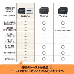 ●効率よく熱を伝えられ、すばやく焼き上げる石窯仕立てのオーブントースター●自動で上手に焼けるマイコンタイプ●外はサクッと、中はふんわりとした絶品トーストに仕上げる「サクふわトースト」コース●好きな具材をのせて楽しむ「アレンジトースト」コース●同時にトースト4枚焼ける「ひろびろ庫内」●メニューに合わせて調節できる「80℃~高温250℃温度調節」●ホーロー加工の「こんがりトレー」●お手入れ簡単「はずせるとびら」●料理のバリエーションが広がるデジタル表示で分かりやすい「30分ロングデジタルタイマー」」●トレー収納ラックつき