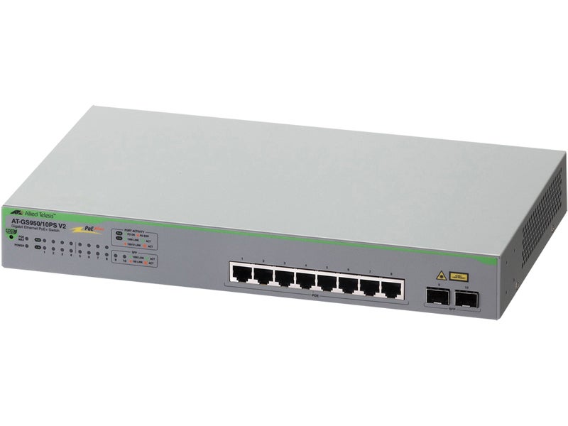 AT-GS950/10PS V2(RoHS対応)は、10/100/1000BASE-Tポートを 8ポート、SFPスロットを 2スロット装備したギガビットイーサネット・スマートPoE+スイッチです。10/100/1000BASE-Tポートの 8ポートは IEEE 802.3at準拠の PoE+機能を搭載しており、1本のイーサネットケーブルで通信データと大容量電力供給を可能にします。