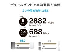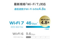 ■新規格「Wi-Fi 7」&インターネットポート2.5Gbpsに対応したスタンダードモデルのWi-Fi 7ルーターです。新規格「Wi-Fi 7」に対応し、2つの周波数帯で高速通信が可能です。部屋の中心に置いても家電のように違和感のない『生活になじむデザイン』を目指し設計しました。■「Wi-Fi 7」とは、Wi-Fi 6/6Eをベースとし、通信速度と安定性が向上した新しいWi-Fi規格です。最大通信速度が46Gbpsまで増加しました。複数周波数帯を同時に利用できるMLO(Multi-Link Operation)機能により、従来規格から通信速度と安定性が飛躍的に進化しました。■5GHz、2.4GHzの2つの周波数帯に対応。各帯域でそれぞれ最大5GHz/2882Mbps、2.4GHz/688Mbpsの高速通信が可能です。また、MLO(Multi Link Operation)技術に対応し、データ伝送時に2.4/5GHzの2つの周波数を同時に利用してより高速に通信を行う事ができます。■インターネット接続(WAN)ポートが2.5GbEに対応しており、本商品のWi-Fi 7の性能を生かす事ができます。