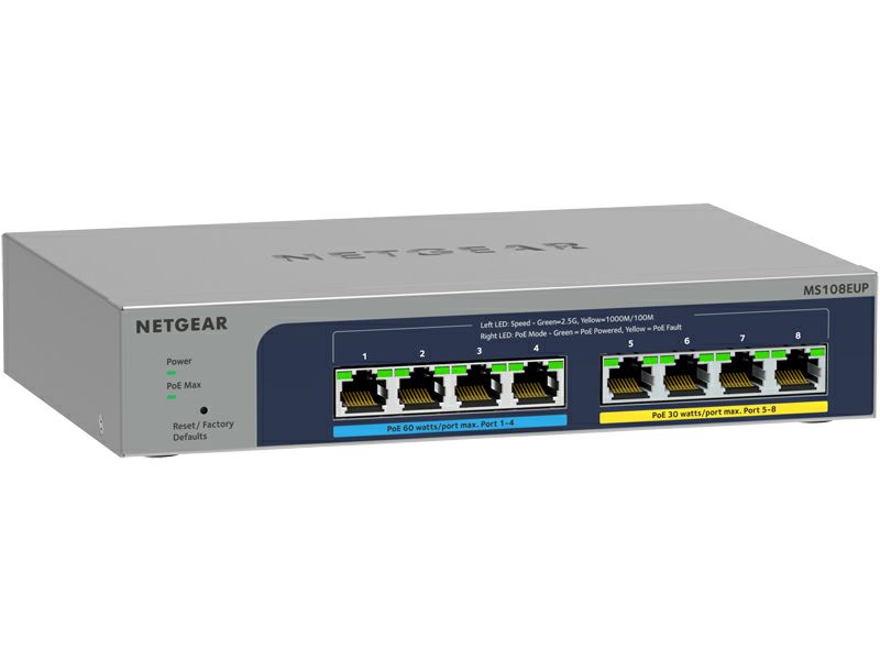 1G/2.5Gマルチギガポートを8基搭載したアンマネージプラススイッチ。マルチギガポートは既存のCat5e/Cat6ケーブルを使用して2.5Gの高速スピードを実現できます。ポート1-4はIEEE802.3bt Ultra60 PoE++に対応(1ポートあたり60W)、ポート5-8はIEEE802.3at PoE+に対応(1ポートあたり30W)しており、スイッチ全体で230Wの電力を供給します。2.5Gポート搭載のWiFi 6対応アクセスポイントや高画質IPカメラの接続に最適です。日本語対応のWebベース管理画面で簡単に設定が可能。ファンレス静音設計のため、会議室など動作音を気にする場所にも設置できます。デスクトップ設置のほか、壁掛けキット付属で壁面への取り付けもできます。
