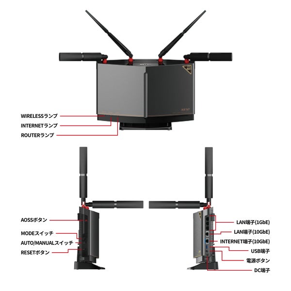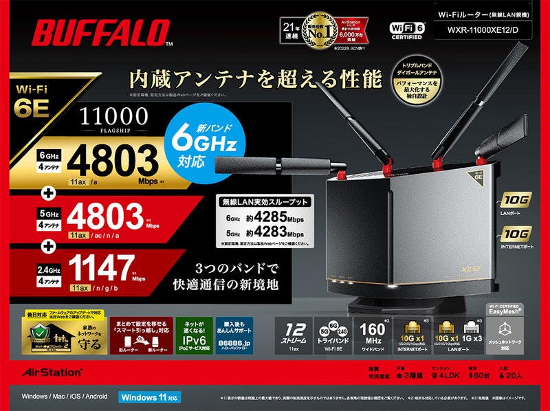 他の画像を見る バッファロー [WXR-11000XE12/D] 無線LAN親機 WiFiルーター 11ax/ac/n/a/g/b 4803+4803+1147Mbps WiFi6E/Ipv6対応 ネット脅威ブロッカー2プレミアム搭載 チタニウムグレー ¥ 45,429 税込 カートに入れる お気に入りに登録する