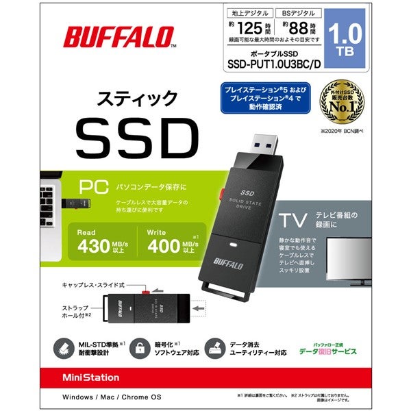 他の画像を見る バッファロー [SSD-PUT1.0U3BC/D] 外付けSSD ポータブル USB3.2 Gen1 スティック型 TV録画対応 1.0TB ブラック ¥ 17,380 税込 在庫切れ 詳細を見る お気に入りに登録する
