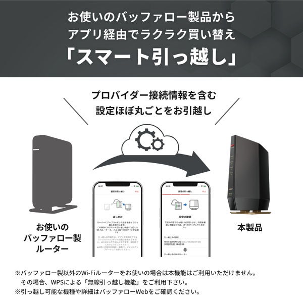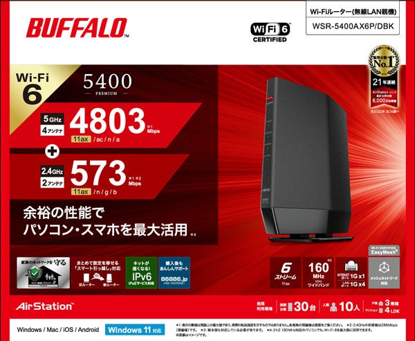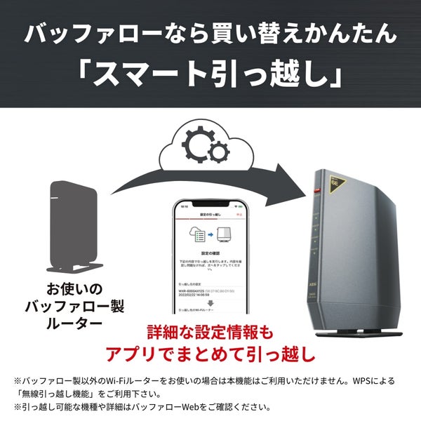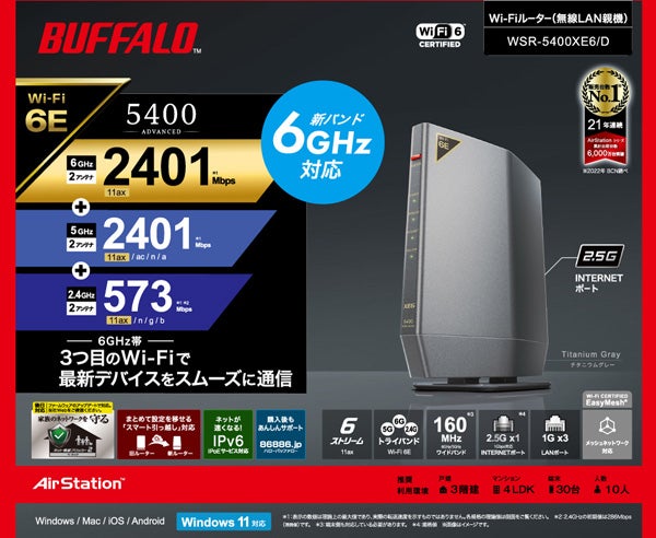他の画像を見る バッファロー [WSR-5400XE6/D] 無線LAN親機 WiFiルーター 11ax/ac/n/a/g/b 2401+2401+573Mbps WiFi6E/Ipv6対応 ネット脅威ブロッカー2ベーシック搭載 チタニウムグレー ¥ 16,871 税込 カートに入れる お気に入りに登録する