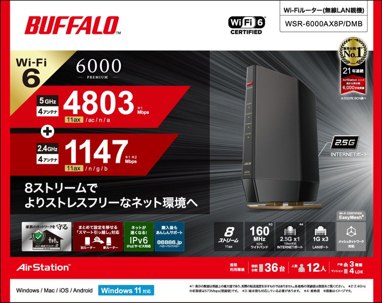 他の画像を見る バッファロー [WSR-6000AX8P/DMB] 無線LAN親機 WiFiルーター 11ax/ac/n/a/g/b 4803+1147Mbps WiFi6/Ipv6対応 ネット脅威ブロッカー2ベーシック搭載 マッドブラック ¥ 17,618 税込 カートに入れる お気に入りに登録する