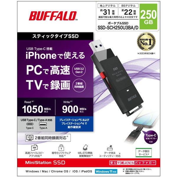 他の画像を見る バッファロー [SSD-SCH250U3BA/D] USB3.2(Gen2)対応 TV録画 スティックSSD 250GB ブラック USB Type-Cコネクタ付属 ¥ 12,570 税込 在庫切れ 詳細を見る お気に入りに登録する