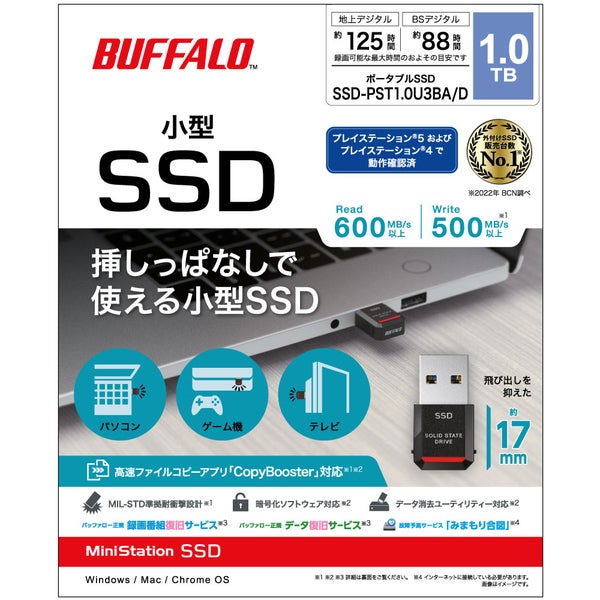 他の画像を見る バッファロー [SSD-PST1.0U3BA/D] 外付けSSD ポータブル USB3.2 Gen2 小型 TV録画対応 1TB ブラック ¥ 33,980 税込 在庫切れ 詳細を見る お気に入りに登録する