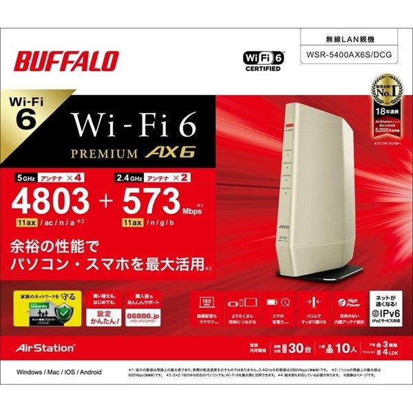 他の画像を見る バッファロー [WSR-5400AX6P/DBK] 無線LAN親機 WiFiルーター 11ax/ac/n/a/g/b 4803+573Mbps WiFi6/Ipv6対応 ネット脅威ブロッカー2ベーシック搭載 ブラック ¥ 18,665 税込 カートに入れる お気に入りに登録する